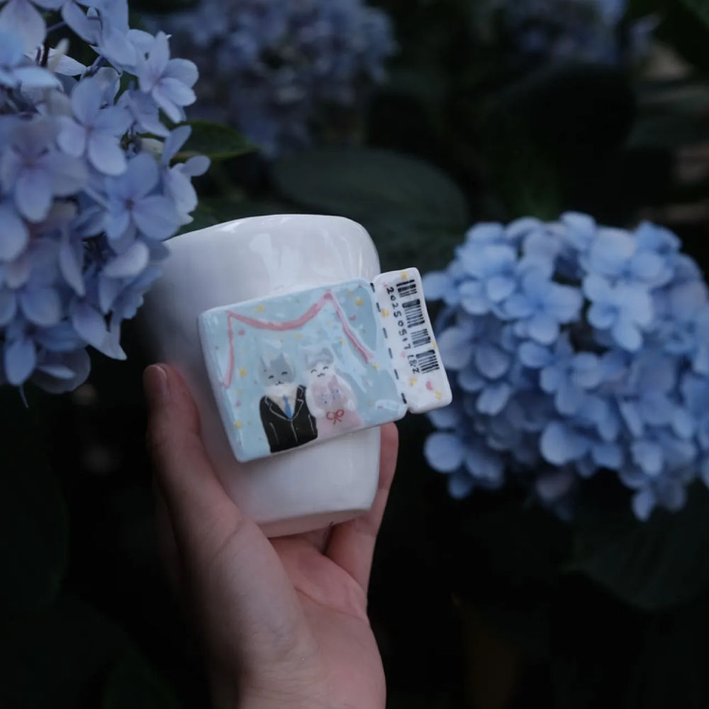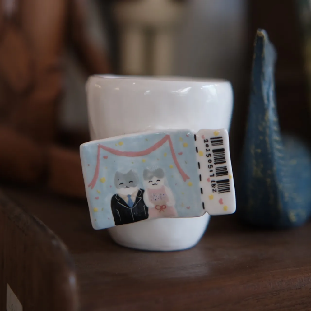 Playful, meaningful and full of handcrafted charm — this ceramic mug captures a tiny wedding scene in the most delightful way. A sculpted tile-like panel is attached to the mug, featuring two adorable cats dressed in wedding attire, surrounded by soft colours, confetti-like dots and gentle ribbon motifs.